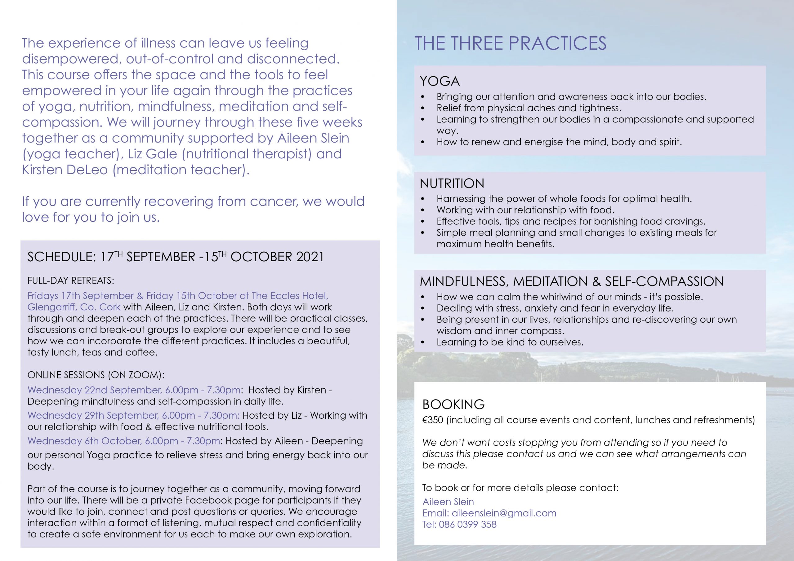 The experience of Illness can leave one feeling disempowered, out of control and disconnected. This course offers space and the tools to feel empowered again through the practices of yoga, nutrition and mindfulness, meditation and self-compassion.