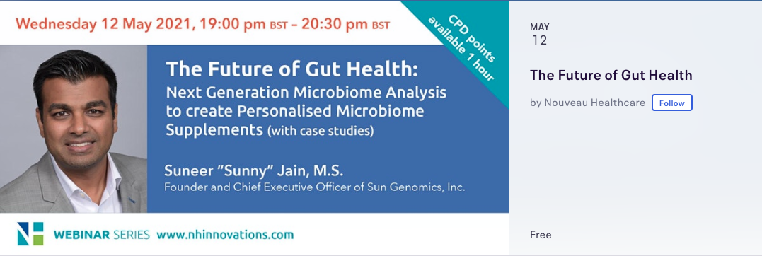 Sunny is going to identify how integrating next generation microbiome testing and analysis can provide improved treatment of microbiome related conditions. Delving into the science and how Sun Genomics use next generation technology and bioinformatics to select and tailor the right pre & pro live bacteria strains used to create a personalised microbiome supplement for your gut needs.